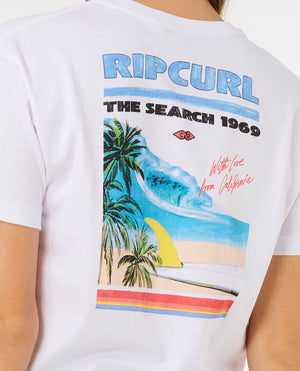 Model ima kratke rukave, crew neck izrez i karakterističan Rip Curl Hayley O print za autentičan surferski izgled. Materijal je prozračan, upija znoj i održava oblik kroz pranja, idealan za surf, skate ili casual outfite.